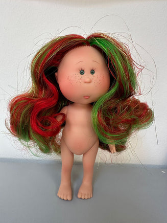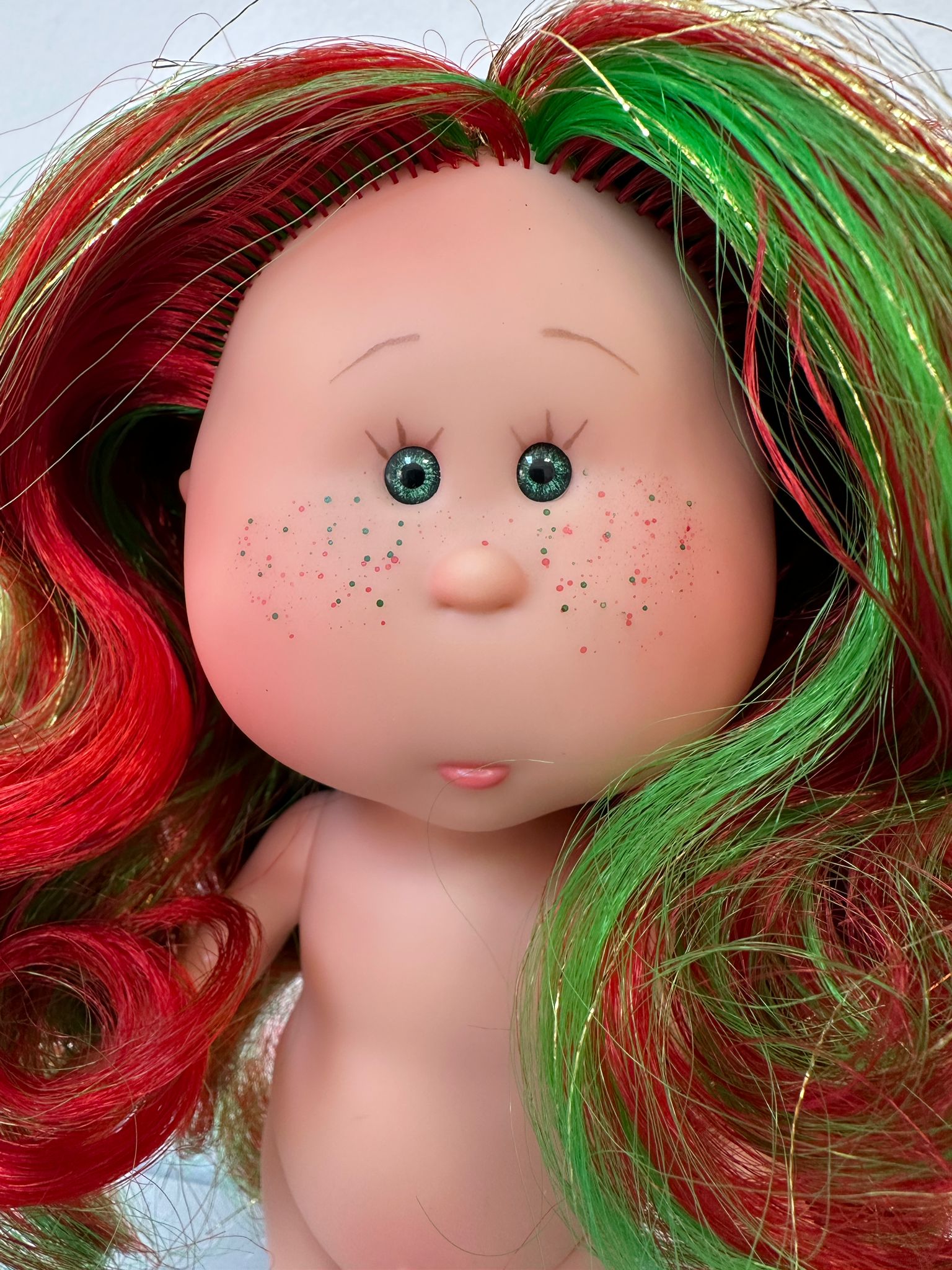 Mini mia.  Hair is green, red, and gold glitter.  Green eyes.  Painted eyelashes.  Green and red freckles.