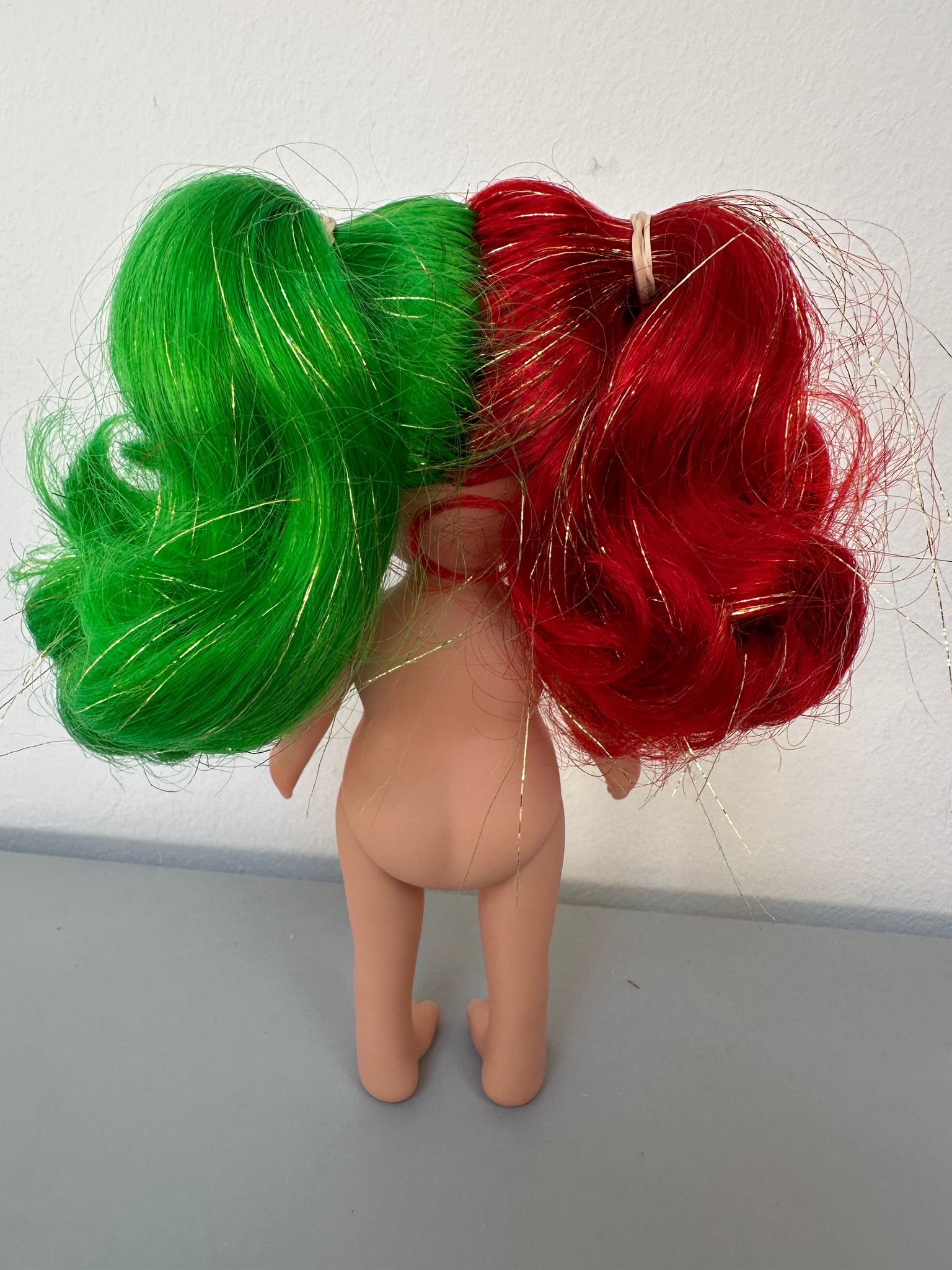Mini mia. Hair is green, red, and gold glitter in pigtails.  Green eyes. Painted eyelashes. Green and red freckles.